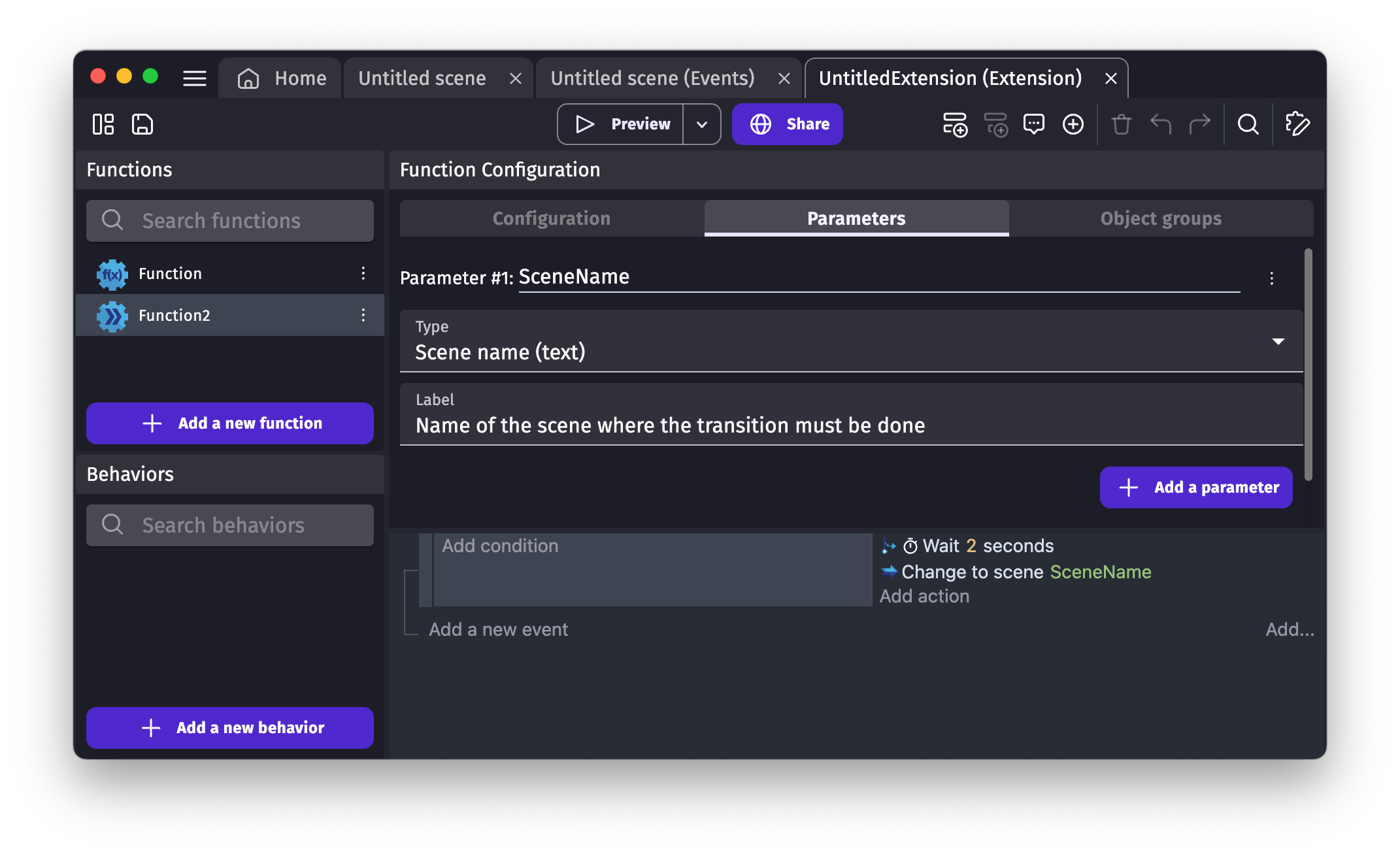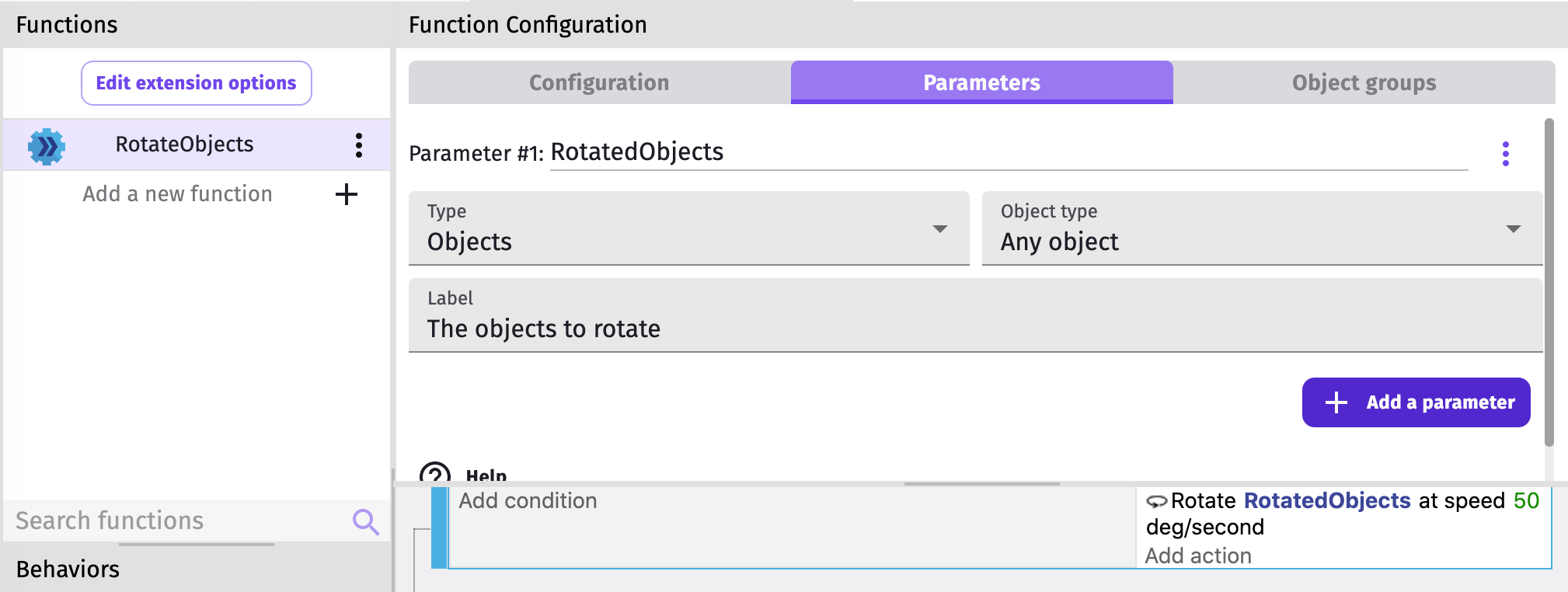 Conditions and actions from behaviors can also be used in functions events. For this, behavior parameters must be added after an object parameter.