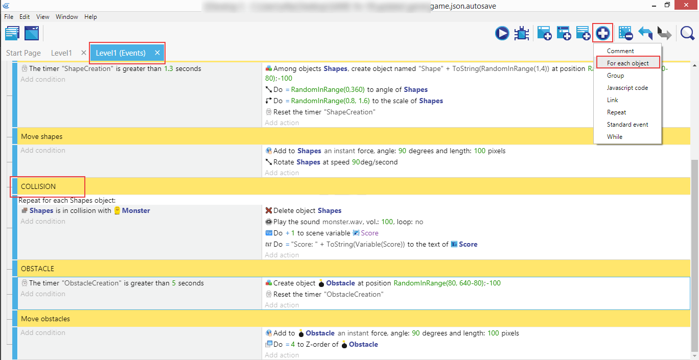 This will allow us to have a specific condition "Repeat for each Obstacle object".